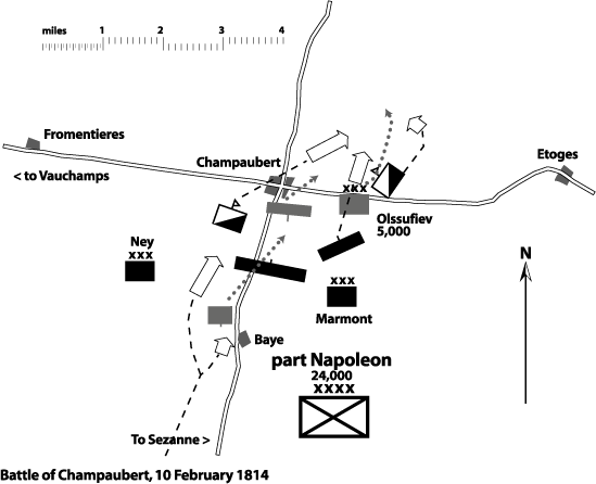 The resulting battle did not take long, for outnumbered 6 to 1 the outcome could never be in doubt. Marmont led his infantry forward under a overcast and wet sky to clash fiercely with Olsuffiev's troops. With the Russian troops pinned down, Napoleon then sent his cavalry forward to complete a double envelopment of the hapless Olsuffiev, by cutting the Montmirail road on both flanks. Now Olsuffiev was trapped, with no chance of escape. Olsuffiev's men fought with grim ferocity, giving a good acccount of themselves, but Marmont's corps, aided by Ney, proved more than a match for their surrounded opponents